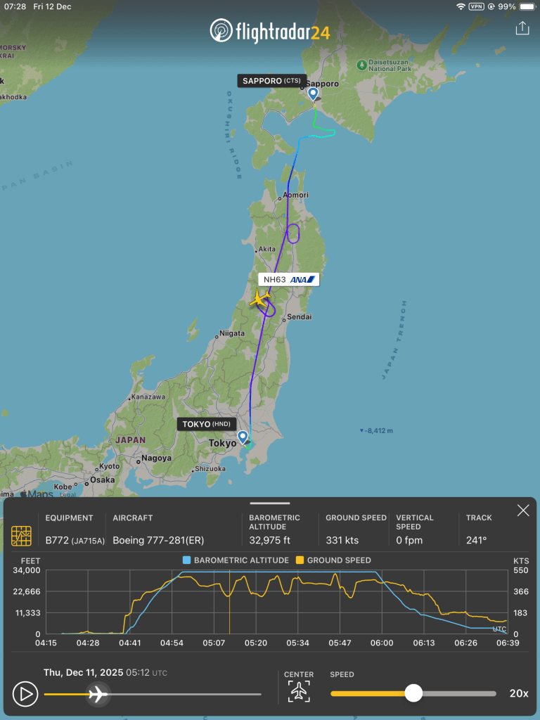 The flight itself was smooth, but the conditions in Sapporo meant we had to fly at a reduced speed. We also had to orbit twice, waiting for our turn to enter the airport control zone while other aircraft circled ahead of us. Every 20 minutes or so, the runway was closed so snow‑clearing equipment could sweep through. What should have been a 1 hour 10 minute flight stretched to a full two hours.