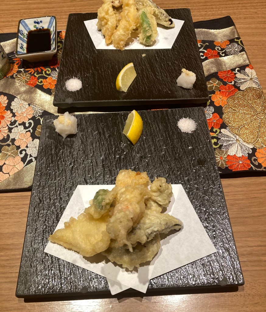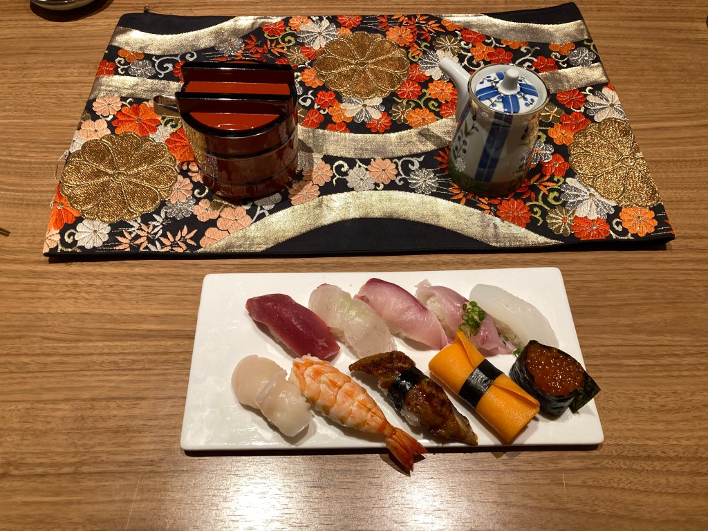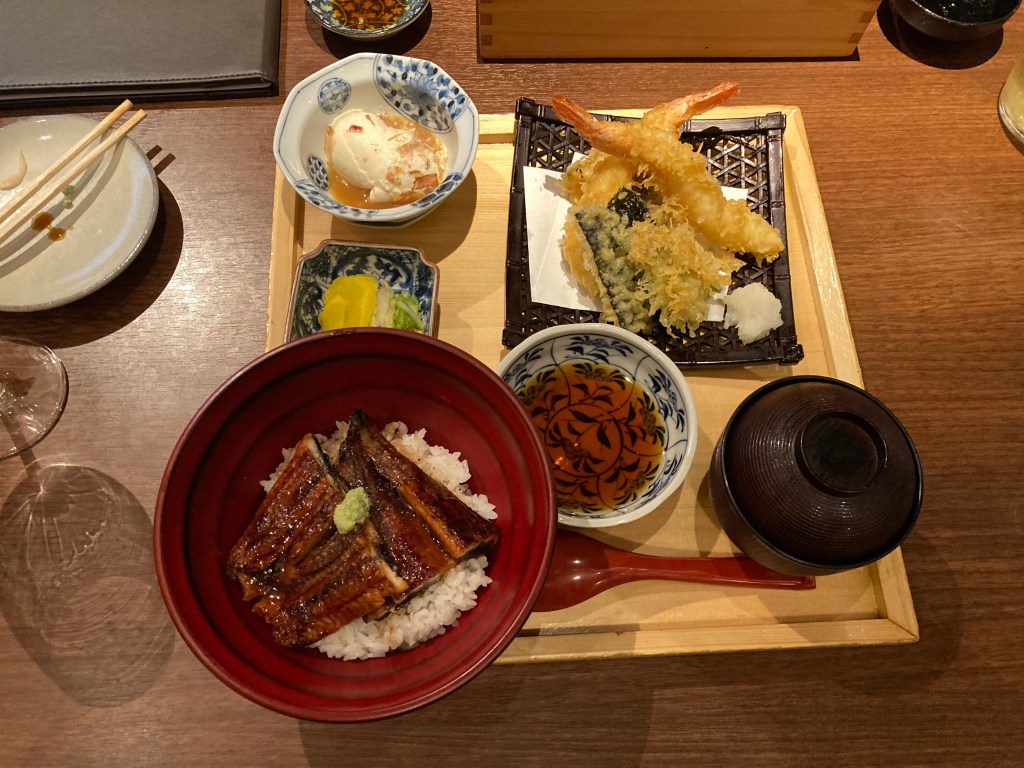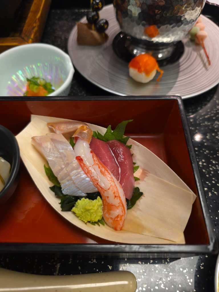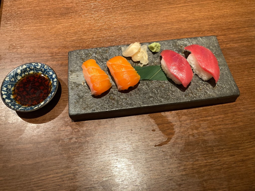 We chose Hyakuzen Restaurant, and it turned out to be an excellent decision. We each ordered a different bento-style set meal: I went for the Unagi Set with Tempura, while Maree enjoyed the Shokado Set, also with Tempura. We shared a plate of nigiri—tuna and salmon—and everything was beautifully prepared. Very oishikatta desu.