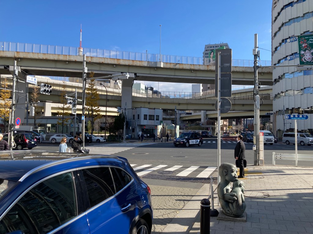 The busy intersection at Azabu Juban with the Shuto (raised expressway) in the background.