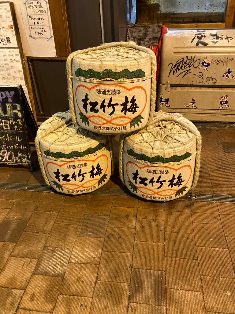 As we wandered through the arcade, we stumbled upon a display of sake barrels—known as komodaru. These ornate wooden casks, typically wrapped in straw, are used in ceremonies and stand as symbols of celebration and good fortune. In the traditional Kagami Bairiki ritual, the lid of the barrel is broken open to share the sake, marking hopes for luck and prosperity. Although the classic barrels are large and wooden, smaller and modern versions are now common as gifts or decorative pieces.