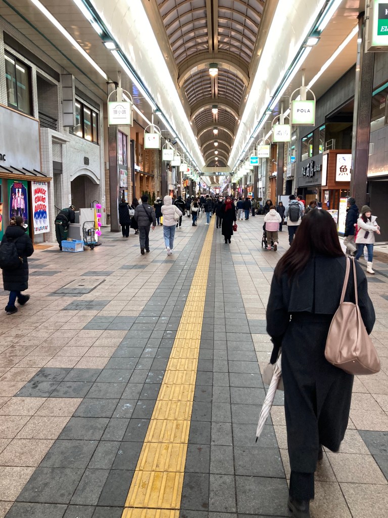 After eating, we wandered into a long arcade of shops that seemed to stretch endlessly into the distance. When we finally reached a major intersection, we looked across the road only to discover that the arcade continued on the other side—again disappearing as far as we could see.