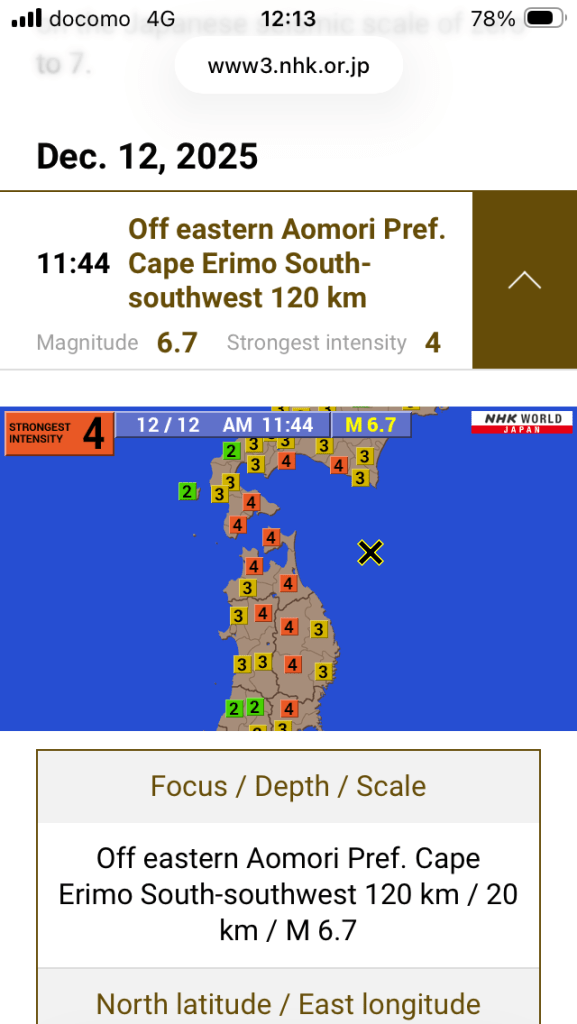 Hi everyone. You’ve probably heard about the earthquake in northeast Japan, roughly 80 kilometres off the coast of Aomori. We’re still in Tokyo, and we definitely felt it here in Haneda. Our hotel shook for about 20 seconds, which woke both Maree and me during the night. We’re not yet sure whether it will affect our plans to travel to Sapporo and Lake Toya later this week.