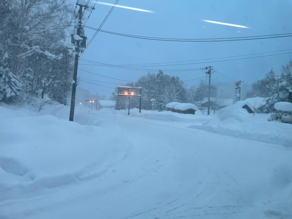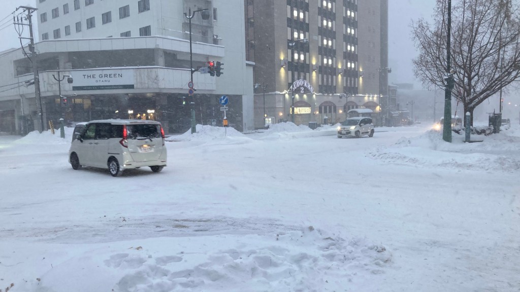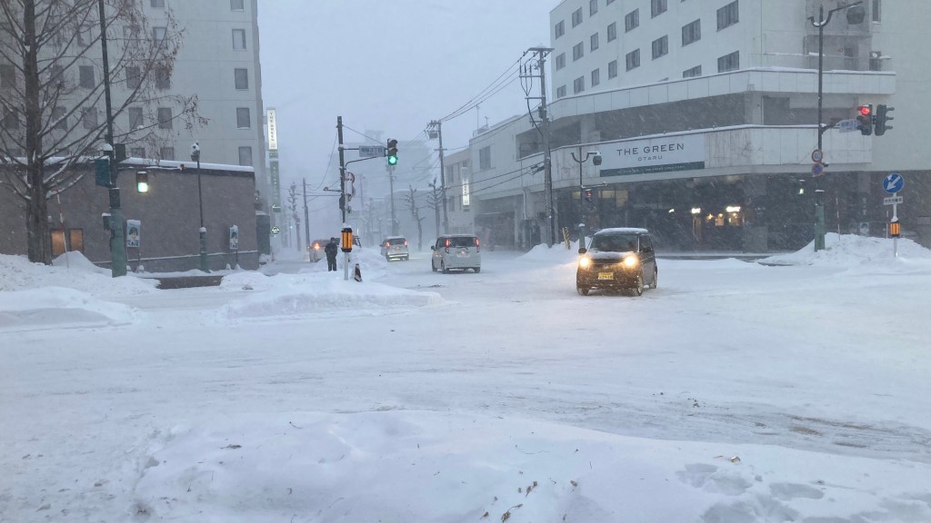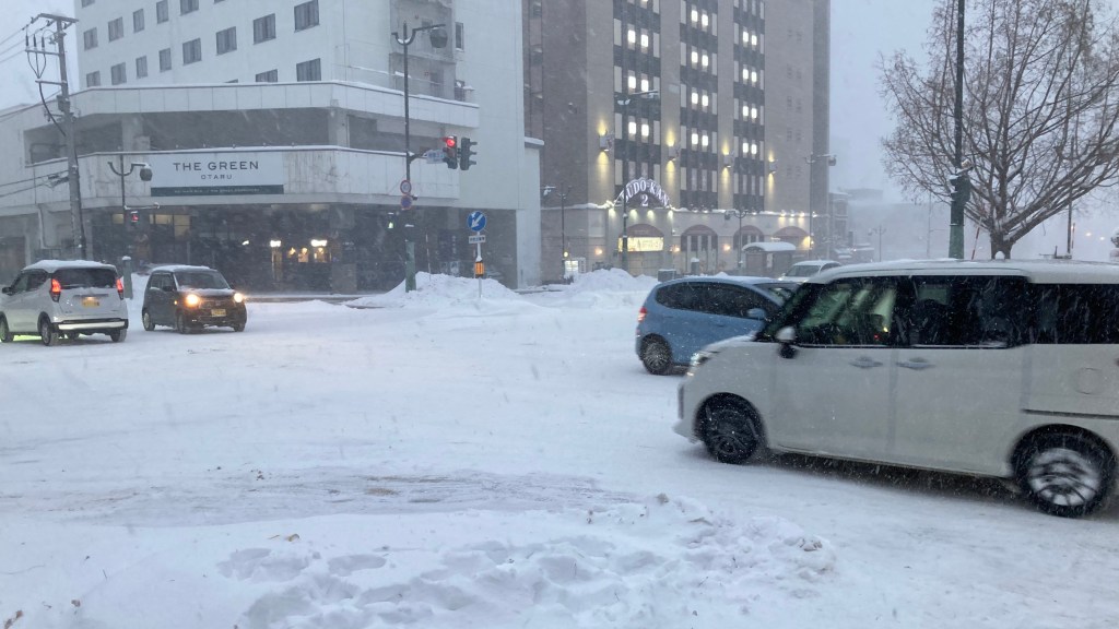 On reaching Otaru, we made our way to a lunch spot recommended by one of Alex’s friends. As we walked, the snowfall suddenly intensified, turning the streets into a soft white blur. While we waited to cross the road to the restaurant, I snapped a few photos of the snow‑covered streets.