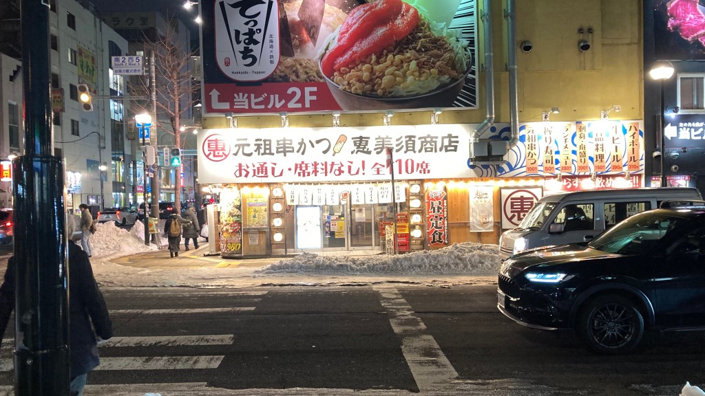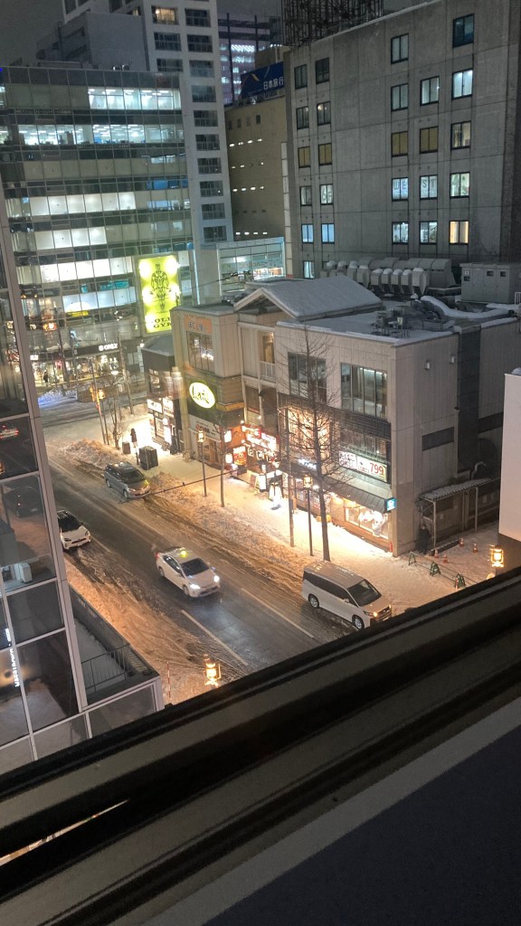 We landed at New Chitose Airport at 15:40, two hours after departing Tokyo. From there, we boarded the Rapid train to Sapporo Station, then grabbed a taxi to our hotel—the snow was still falling, and the roads and footpaths were extremely icy.