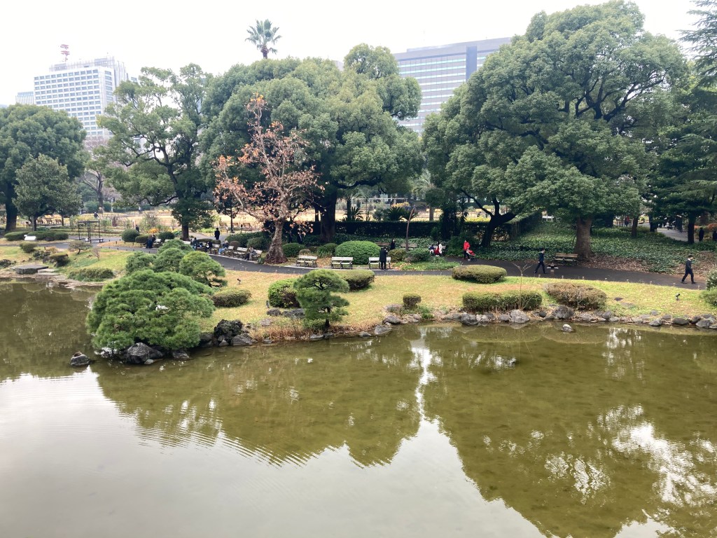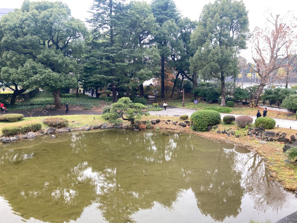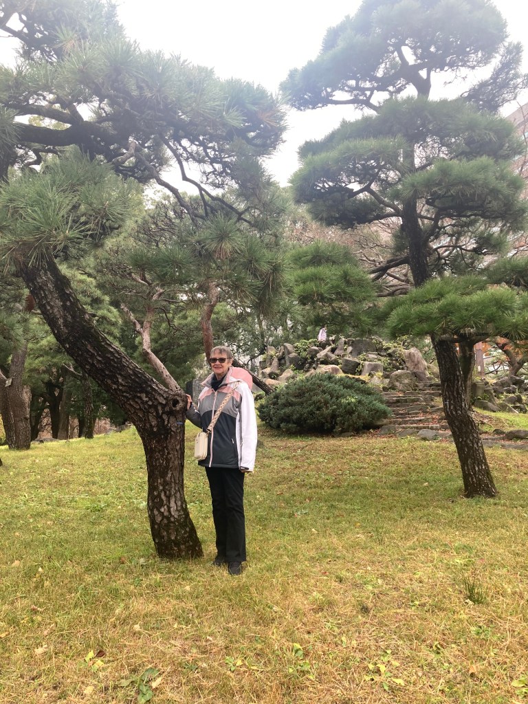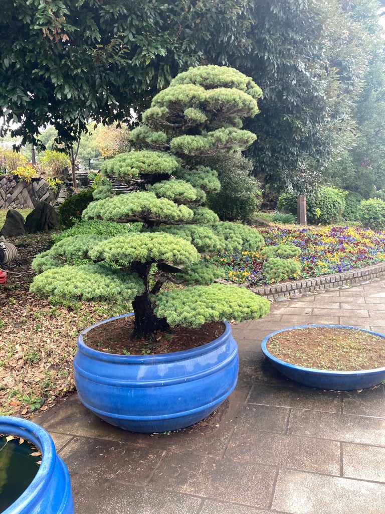 We wandered through the park, taking our time with the gardens. A cluster of striking trees caught our attention—tall yet shaped with the delicate precision of oversized bonsai. Later, we learned that the grounds are designed with traditional Japanese elements, including niwa-ki—carefully sculpted garden trees that echo the aesthetic of bonsai. Many of the species we admired, like zelkova, pines, oaks, wisteria, and even chrysanthemums, are all part of that tradition.