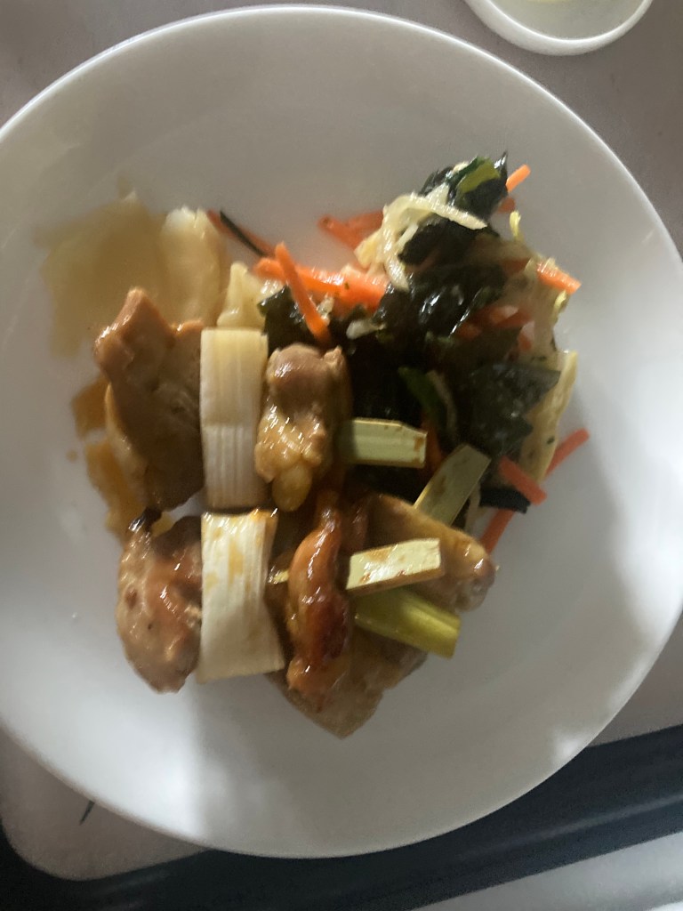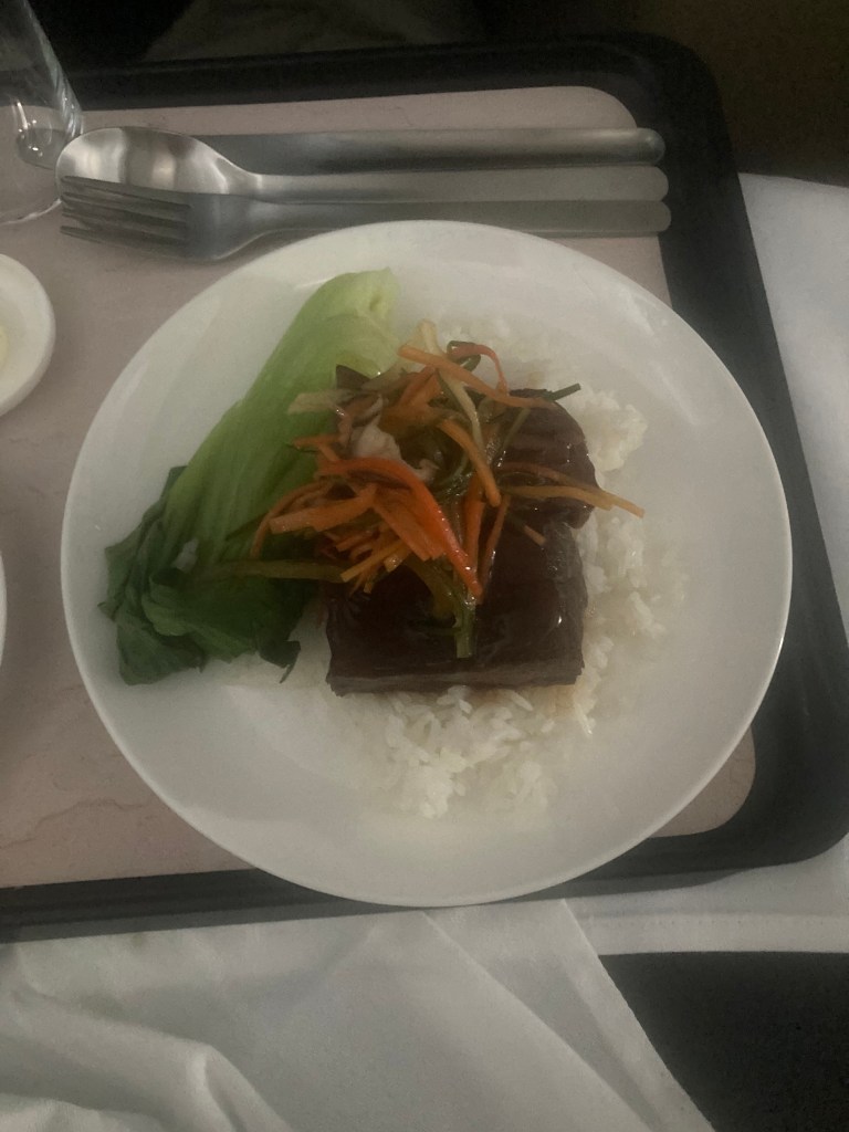 The ten‑hour flight certainly felt long, though the food was a definite highlight. Everything was well prepared, hot, and genuinely tasty. Lunch was served about two hours after take‑off, and dinner arrived roughly an hour before landing. For the first couple of hours, however, all service was suspended due to moderate turbulence with occasional severe patches. The captain came over the intercom to explain that every aircraft in the region was experiencing the same conditions. At one point I could hear what sounded like rain hitting the fuselage, but given our altitude it must have been ice. We were flying through stratus cloud for several hours, which explained the bumps. Eventually the turbulence eased and the rest of the flight was pleasantly smooth.