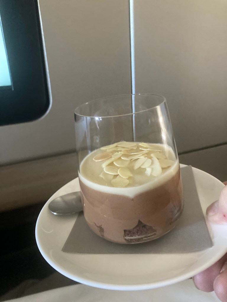 Breakfast was a highlight: banana pancakes topped with a blueberry sauce—light, flavourful, and a refreshing way to start the day. Lunch began with tuna sashimi for me and chicken yakitori for Maree. Both dishes were beautifully prepared, with the sashimi especially fresh and delicate. We followed that with beef ribs for our main course and finished with a rich chocolate mousse. Every course was consistently enjoyable and made the journey feel even more comfortable.