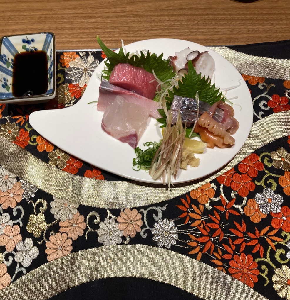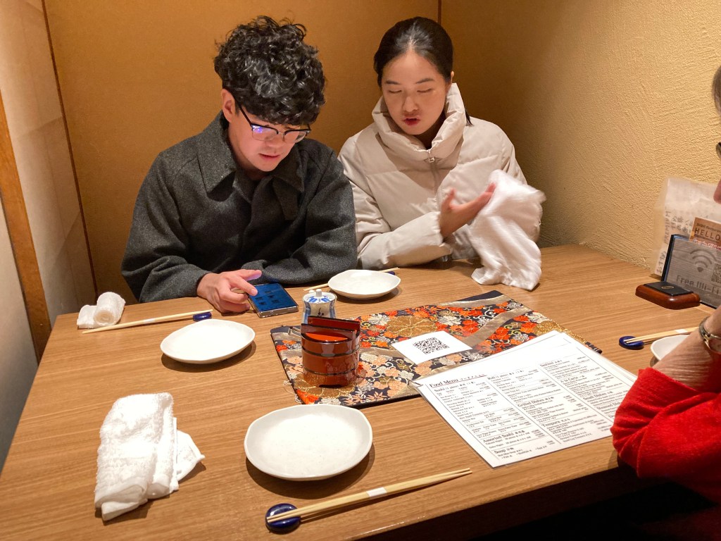 This evening the four of us went out for an early Christmas dinner. Alex and Laorita will be in Nagasaki at the “Miffy Resort” on Christmas Day, while Maree and I will be in Tokyo, so tonight felt like the perfect moment to celebrate together. Alex chose a lovely sushi restaurant close to our hotel.