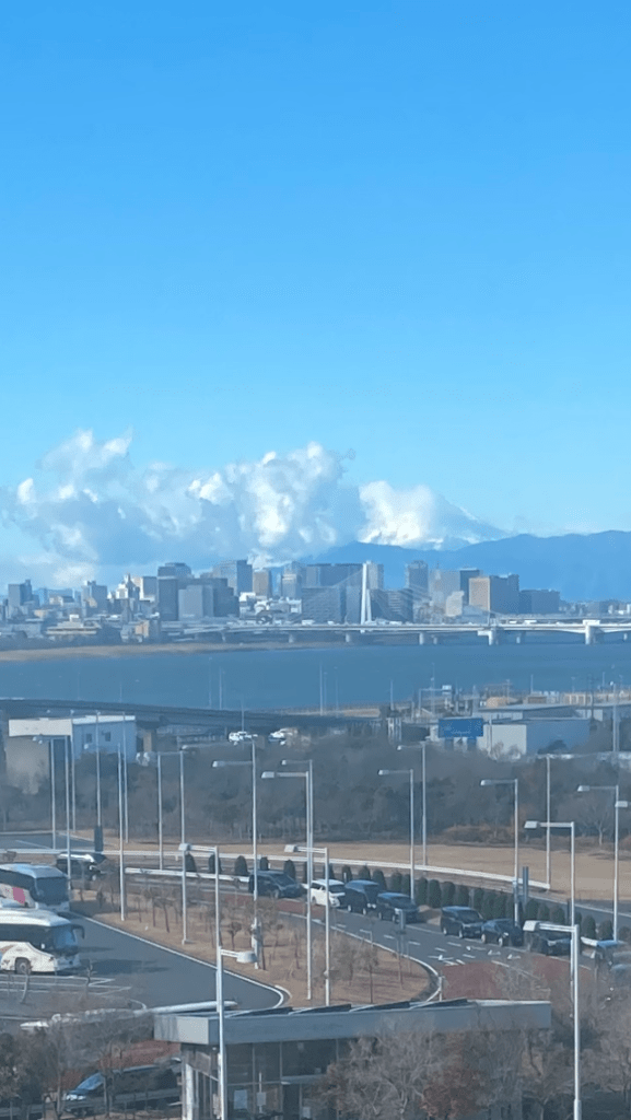 This morning began with a brilliant blue sky, though the wind was strong. When we looked out the window, Mt Fuji was visible but wrapped in a thick shroud of cloud. It took us a moment to realise that the “cloud” wasn’t weather at all — it was the wind sweeping across the snow‑covered peak, lifting plumes of white into the air. With nothing else forming in the sky, it looked almost like steam rising from the summit.